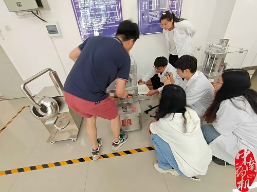 培訓過程中,工程師們不僅系統講解了各設備的工作原理、標準操作規程(SOP)和安全注意事項,更重點傳授了設備的日常維護保養要點和常見故障的排查處理方法。理論結合實踐是本次培訓的亮點。 工程師們指導師生親自上機操作,并使用真實物料進行了現場試機演示。ZP-9壓片機運行穩定,片重差異小;BY-300包衣機包衣均勻;YK-60顆粒機制粒效果良好;DPP-90鋁塑包裝機成型熱封精準,各設備試機均取得了令人滿意的效果,直觀展示了設備的優良性能與操作要點。